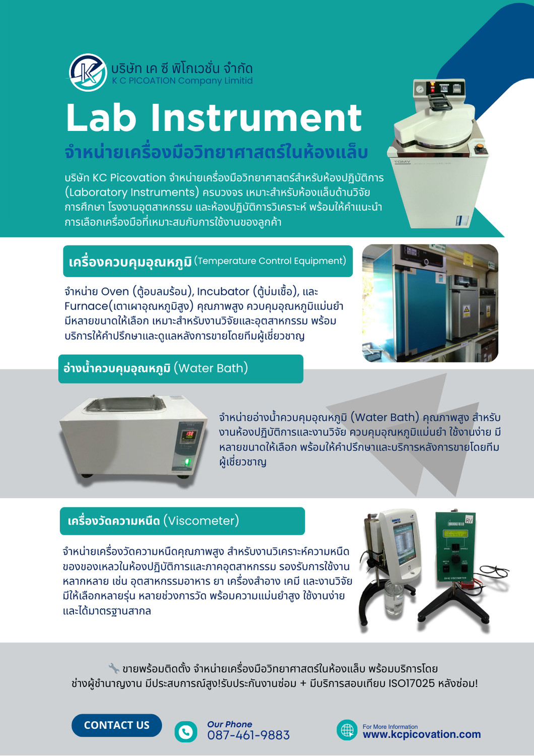 บริษัท KC Picovation จำหน่ายเครื่องมือวิทยาศาสตร์สำหรับห้องปฏิบัติการ (Laboratory Instruments) ครบวงจร เหมาะสำหรับห้องแล็บด้านวิจัย การศึกษา โรงงานอุตสาหกรรม และห้องปฏิบัติการวิเคราะห์ พร้อมให้คำแนะนำการเลือกเครื่องมือที่เหมาะสมกับการใช้งานของลูกค้า